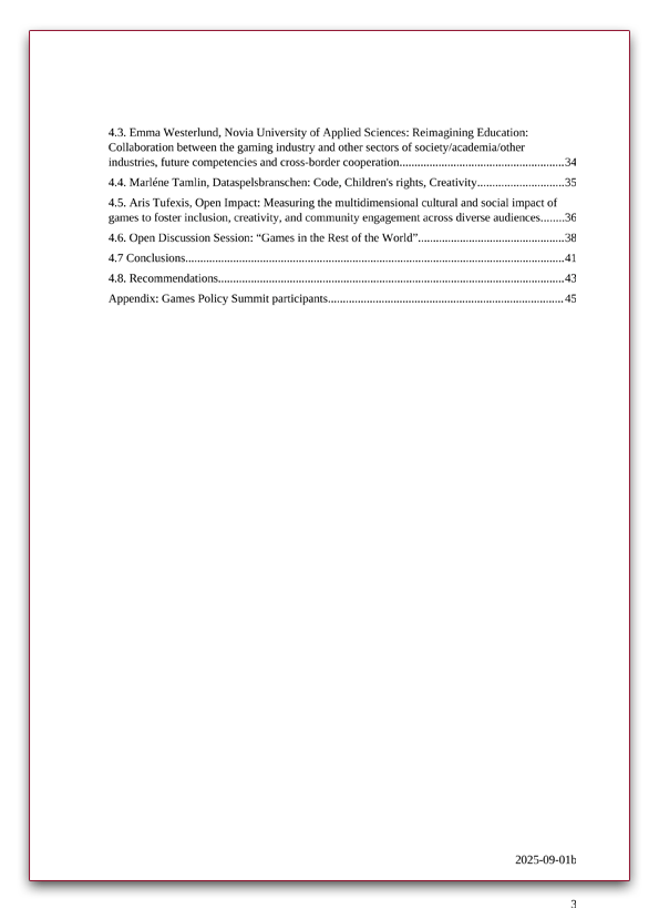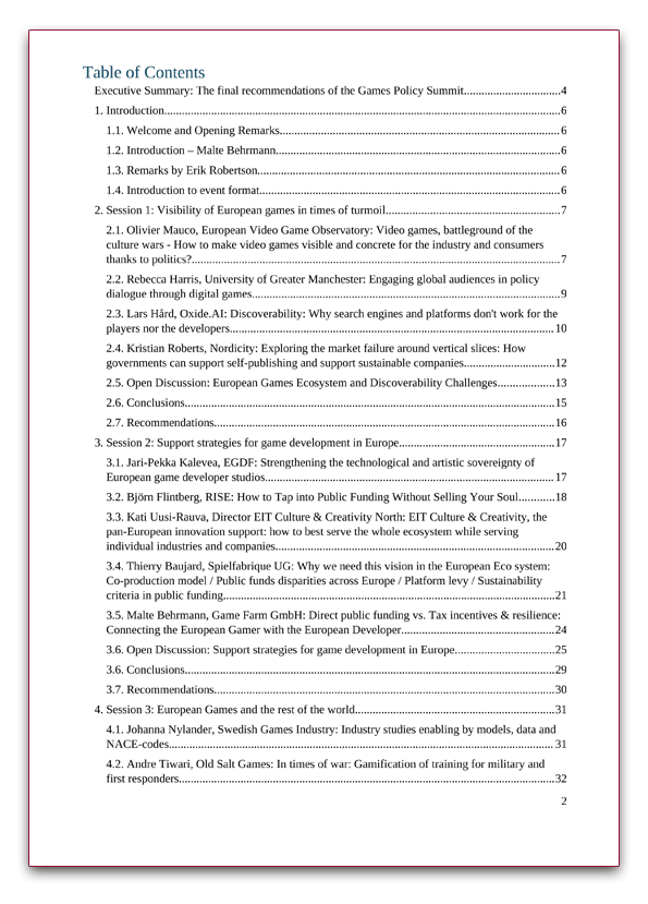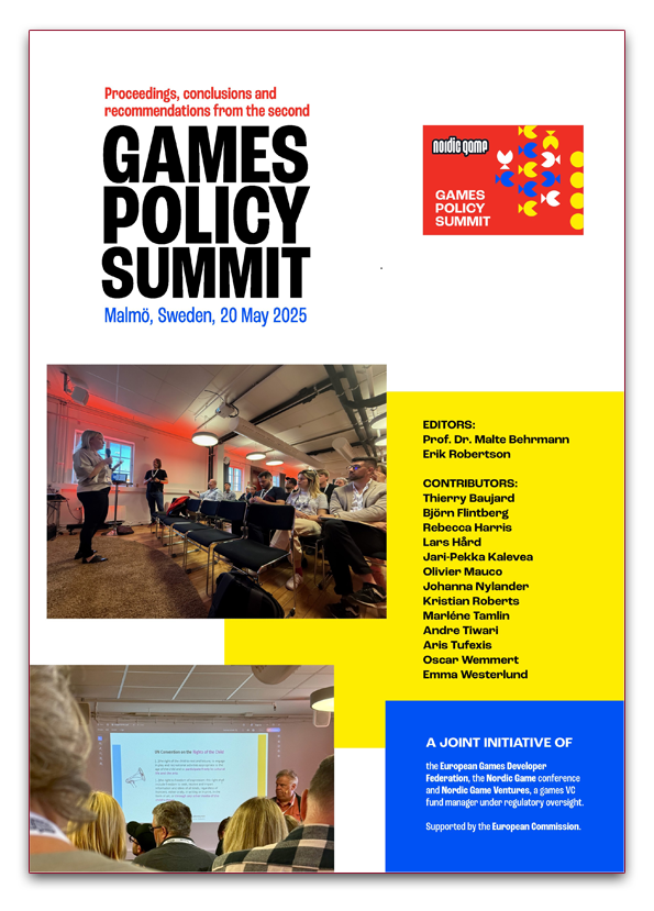 The final recommendations of the Games Policy Summit, held on may 20th 2025 in Malmö, Sweden: Strengthen Technological, Artistic, and Operational Sovereignty in the European Games Industry. Secure essential access to talent, funding and intellectual property rights to empower European game developers in maintaining creative control and fostering resilience within the digital single market. Enhance Discoverability, Audience Development, and Market Integration for European Games. Recognise and Fund Games as Innovative, Cultural, and Civic Technologies. Build and Support Pan-European Creative Ecosystems and Collaborative Networks. Simplify and clarify public procurement pathways in sectors such as defence, healthcare, and emergency response, enabling innovative game developers, particularly SMEs, to access contracts and contribute to public service innovation. Finance tools and services that facilitate early audience testing and iterative game design, improving creative outputs and market fit prior to full release. Shift from risk-focused to rights-based digital participation policies inspired by the UN Convention on the Rights of the Child, promoting safe, meaningful access to digital culture and gaming for young people. Embed this framework within broader cultural and civic engagement strategies, positioning games as inclusive platforms that empower children and vulnerable communities to engage safely and creatively.