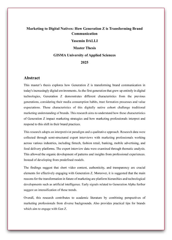 This master’s thesis explores how Generation Z is transforming brand communication in today’s increasingly digital environments. As the first generation that grew up entirely in digital technologies, Generation Z demonstrates different characteristics from the previous generations, considering their media consumption habits, trust formation processes and value expectations. These characteristics of this digitally native cohort challenge traditional marketing understanding of brands. This research aims to understand how these characteristics of Generation Z impact marketing strategies and how marketing professionals interpret and respond to this shift in their brand practices.